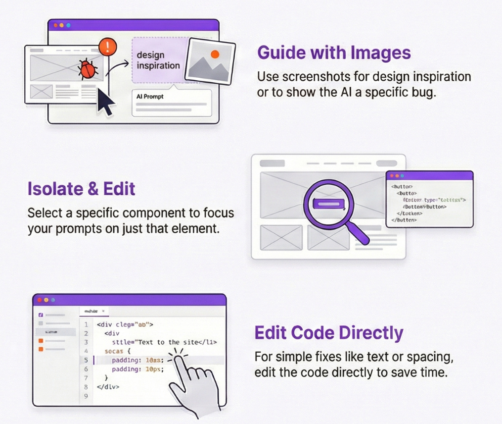 Love the tip about editing code directly. It's really easy to get caught up in the whirlwind of what these AI tools generate and forget to look under the hood. Especially for non-technical people like me, it's a good learning exercise to inspect the code and figure out potentially easy fixes. It gives a feeling of control in a space where it can feel like the AI is running without a leash.