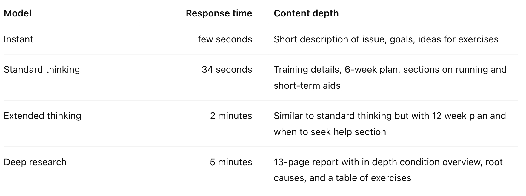 Meanwhile, the Extended Thinking model output took longer for a similar result to the Standard model and paled in comparison to Deep Research. The Deep research guide gave me accurate and helpful guidance and still completed in a respectable 5 minutes.
