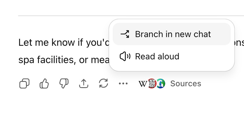 Use ChatGPT’s new “Branch” feature: This feature just launched yesterday! It allows you to effectively duplicate your chat so that you can carry it forward in a different direction than your main chat.